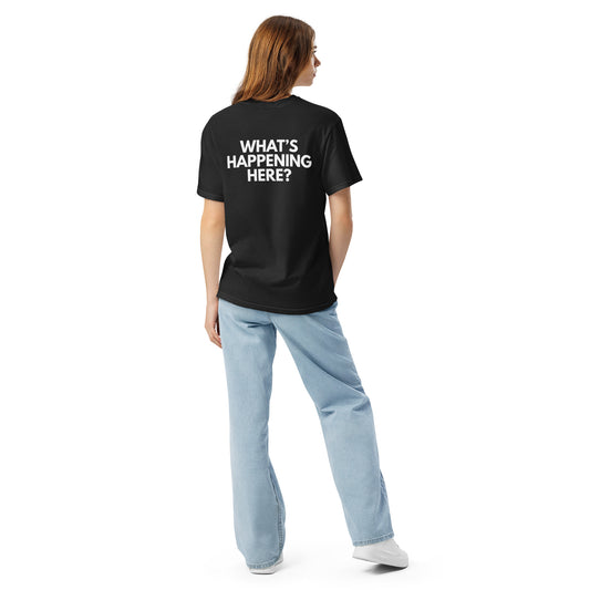 Unisex Short Sleeve Black T-Shirt - What's Happening Here? - FULL LOGO